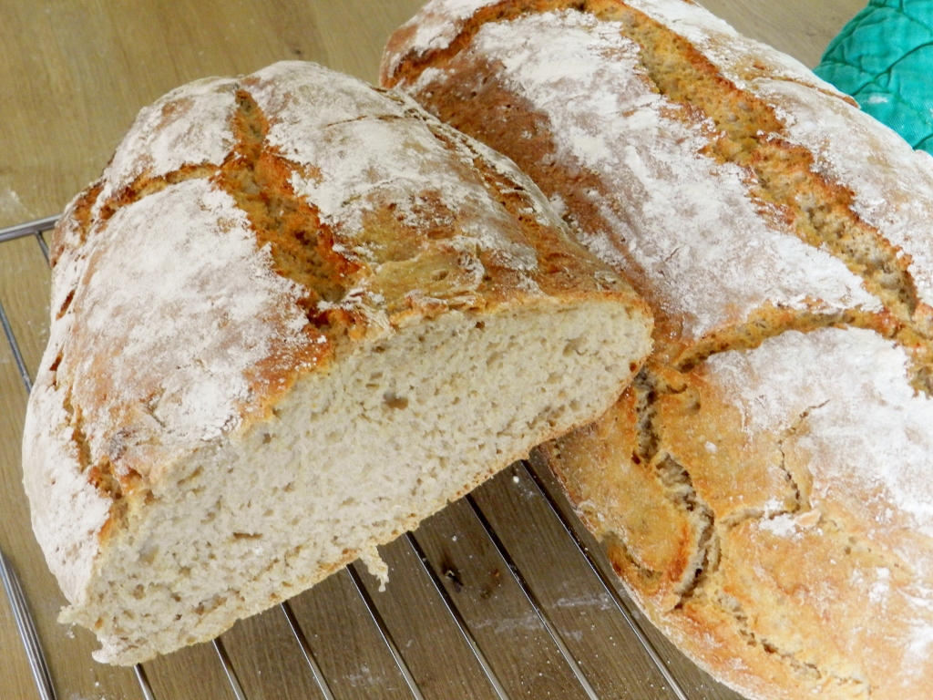 Verkneten, 30 Minuten rasten lassen, erneut durchkneten, dann den Teig in 2 Stücke teilen, jeweils in Mehl wälzen und zu einem länglichen Brot formen. Die Brote dann im Warmen noch 1 Stunde aufgehen lassen (am besten bei 30-40°, abgedeckt im Backrohr). Anschließend im vorgeheizten Backrohr (mit Wassertopf) bei 200° Heißluft 30 Minuten backen.