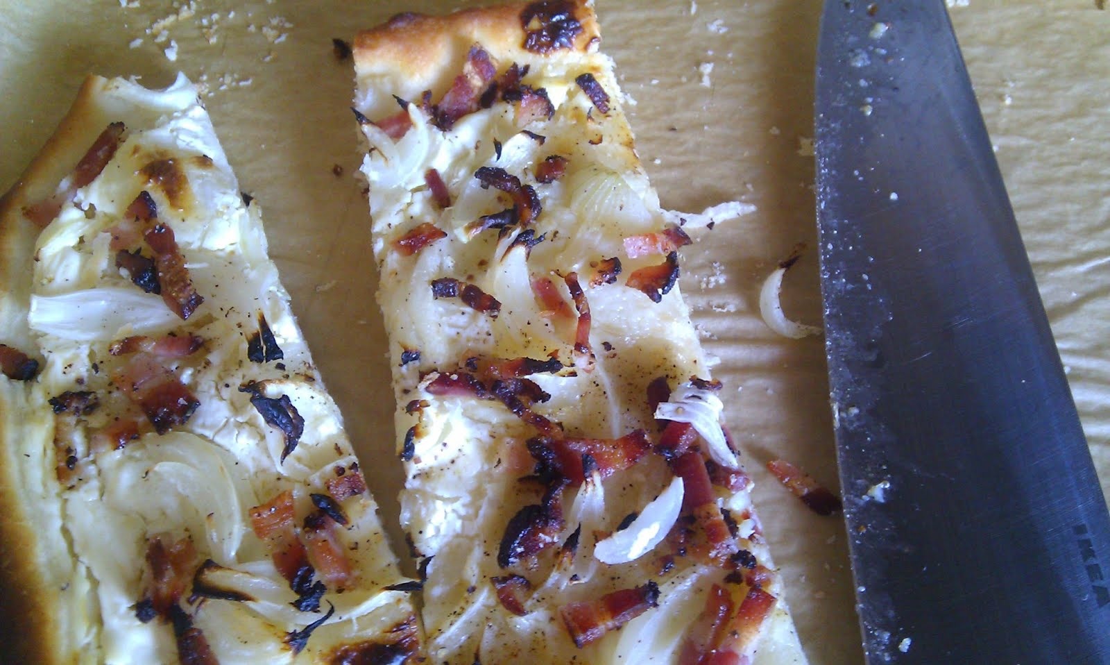 Den Teig gehen lassen, am besten 2x wieder zusammenkneten und erneut gehen lassen. Dann in 2 Teile teilen, auf Backpapier je blechfüllend ausrollen (wird sehr dünn). Den Teig mit je einem Becher Creme Fraiche bestreichen, die nudelig geschnittenen Zwiebel und Speckstreifen darauf verteilen, salzen und pfeffern.Das Backrohr auf maximale Hitze (+ Heißluft) vorheizen, dann nacheinander die Flammkuchen auf mittlerer Schiene 9-12 Min. backen.