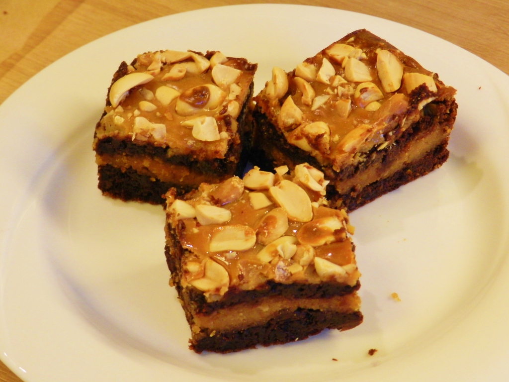 Eine große Backform (ca. 35×25) am Boden mit Backpapier auslegen. 2/3 des Teiges in die Form geben, dann die gesamte Füllung darauf und mit dem verbleibenden Drittel des Teiges abdecken (mit dem Löffel kleine Häufchen aufsetzen, damit es sich leichter gleichmäßig verteilen lässt).Das Karamelltopping in Bahnen oder einfach löffelweise darauf geben und eventuell etwas mit der obersten Teigschicht verwirbeln, nicht zu viel und nicht zu tief; Erdnüsse grob hacken und darauf streuen.