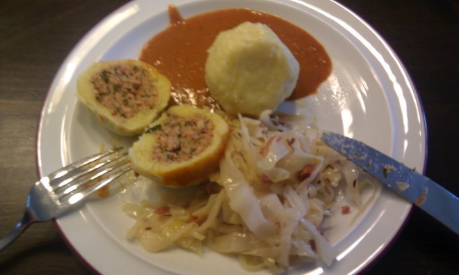 Hascheeknödel mit Gulaschsaft und warmem Krautsalat