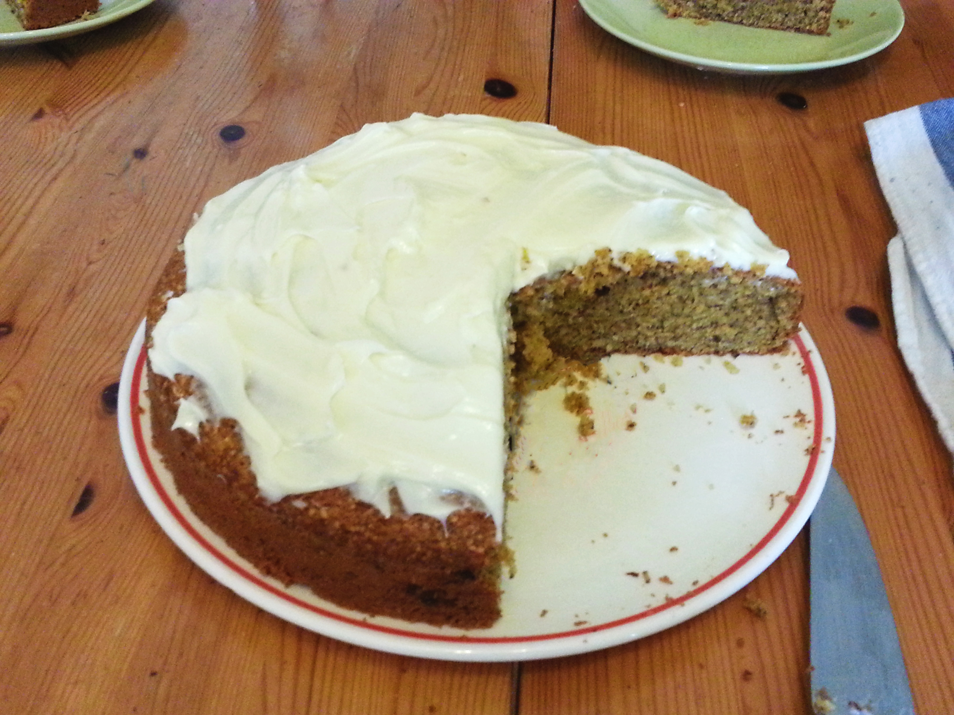 Nach dem Abkühlen mit dem Icing aus verrührtem Frischkäse, Staubzucker und Zitronensaft bestreichen.