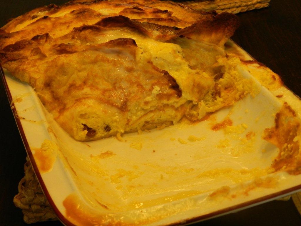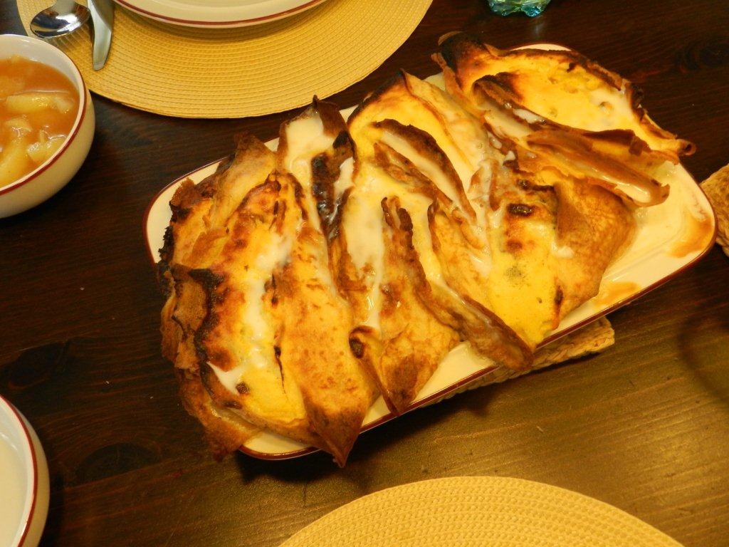 Auf jede Palatschinke 3 EL Fülle geben, dachziegelartig in eine Auflaufform füllen und mit der Zuckermilch übergießen, 40-45 Minuten backen.